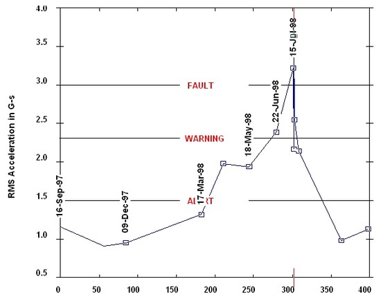 ±¸¸§,º¼ º£¾î¸µÀº ȸÀüÇÏ´Â ÃàÀÇ ÇÏÁßÀ» ¹Þ¾Æ¼­ ÁöÁö´ë¿¡ Àü´ÞÇÏ´Â Áß°£ ºÎǰÀ¸·Î¼­ ±âº»ÀûÀ¸·Î º¼°ú ·¹À̽º °£ÀÇ Á¡ Á¢ÃË ¸éÀûÀ» ÁÙ¿©ÁÖ±â À§Çؼ­ À±È°ÀÌ ¹Ýµå½Ã ÇÊ¿äÇϸç, Ãæ°ÝÀ½ÀÌ ¹Ýµå½Ã Á¸ÀçÇÑ´Ù. ¶ÇÇÑ ±¸¸§,º¼ º£¾î¸µÀº °è¼ÓÀûÀÎ ¸¶Âû·Î ÀÎÇØ ¸¶¸ð»óŰ¡ ÁøÀüµÉ °æ¿ì, ´õ ÀÌ»ó ±¸¸§ÁöÁö¿ä¼Ò·Î¼­ÀÇ ±¸½ÇÀ» ¸øÇÏ°Ô µÇ¹Ç·Î À̸¦ ¹Ì¸® ¿¹»óÇÏ°í ¹æÁöÇÏ´Â °ÍÀÌ ¼³ºñ°ü¸®ÀÚÀÇ ÁÖ¿äÀÓ¹«ÁßÀÇ Çϳª¶ó°í ÇÒ ¼ö ÀÖ´Ù. º£¾î¸µÀÇ °áÇÔÁøÀü»óŸ¦ Áøµ¿½ºÆåÆ®·³(Vibration Spectrum)À¸·Î È®ÀÎÇØ º¸¸é ¾Æ·¡¿Í °°´Ù.